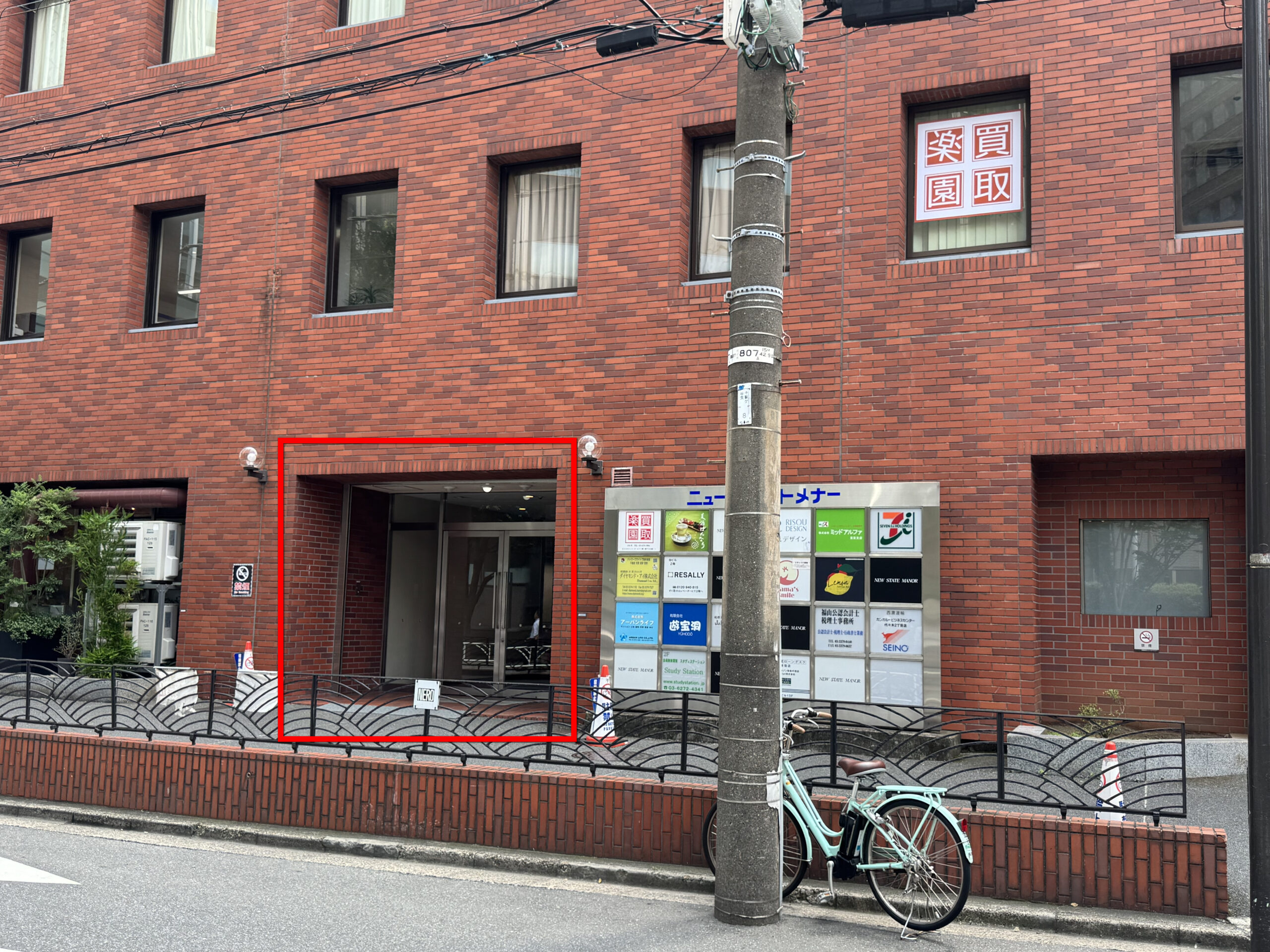 ※弊店は3階建て(低層棟)の2階にあります。上記の赤枠が入口となります。アーチ型のエントランスの左側にあります。